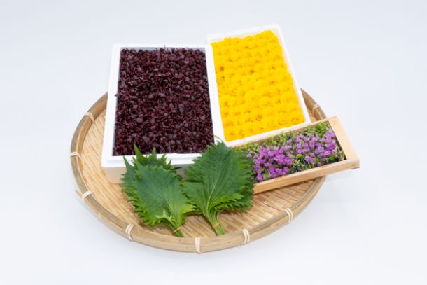 定番の大葉、大葉のSサイズ、紅たで、食菊、穂紫蘇、金魚草など常時在庫販売しており、その他、季節に応じた様々なご提案しています